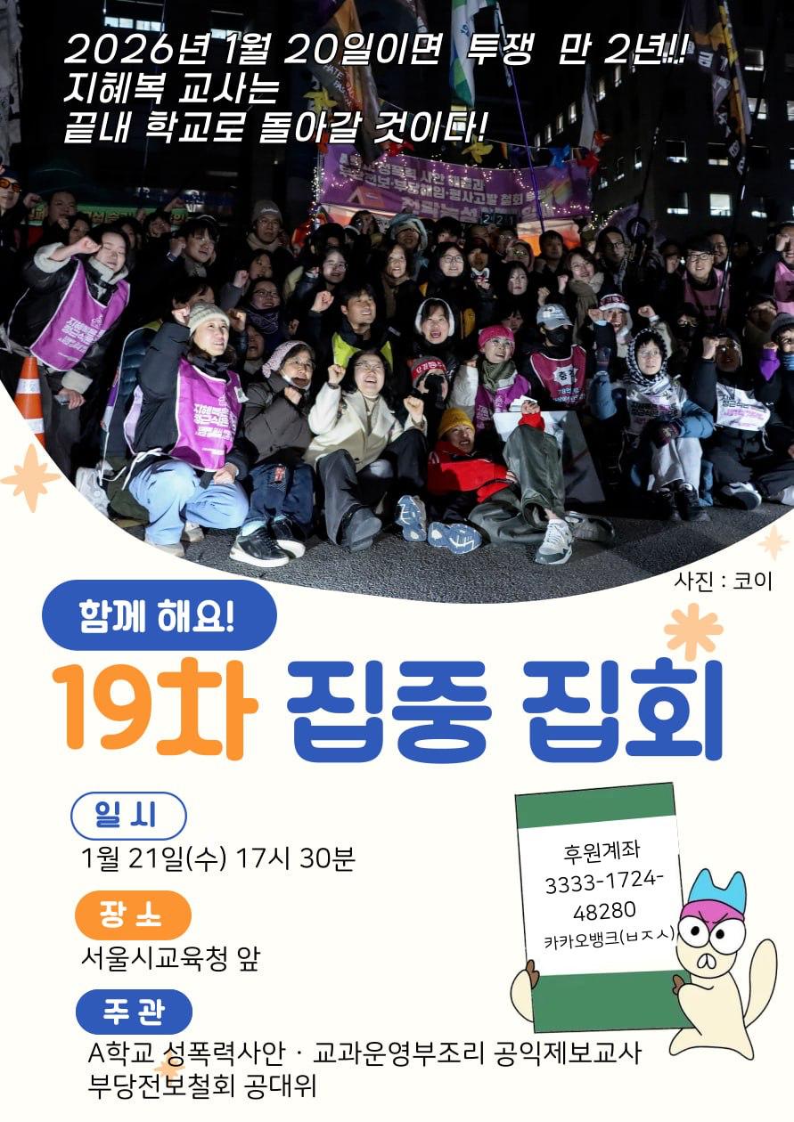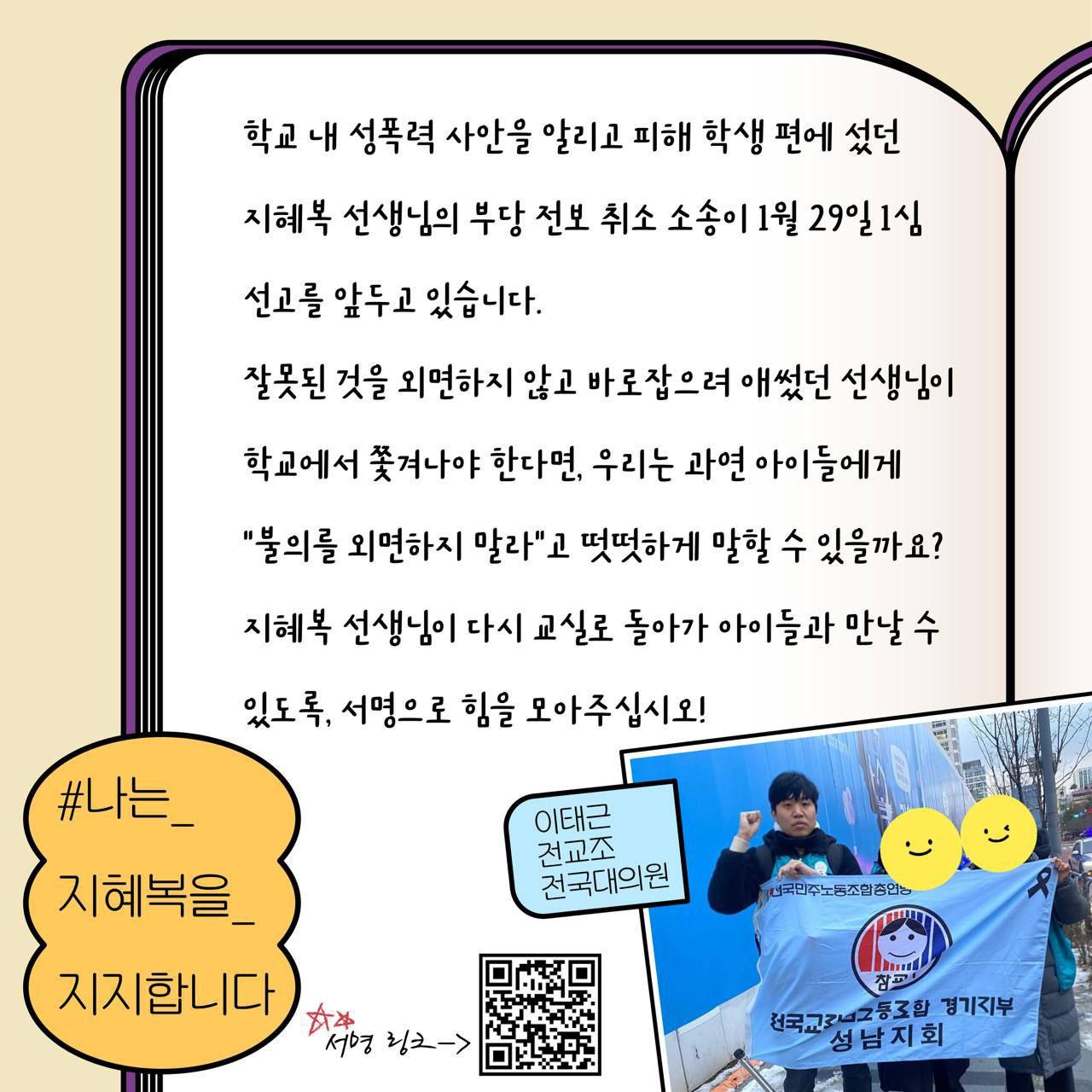 1μ 29μΌ μ§ν볡 κ΅μ¬ λΆλΉμ 보 μ·¨μμμ‘ 1μ¬ μ κ³ κ° μμ΅λλ€. νκ²°μ μλκ³ , μ¬νλΆμ μ§ν볡 κ΅μ¬ λΆλΉμ 보 μ·¨μλ₯Ό μꡬνλ μλͺ μ΄λμ μ§νν©λλ€. μμ§λ μμΈμκ΅μ‘μ² μ κ·Όμ κ΅μ‘κ°μ μ§ν볡 κ΅μ¬ 곡μ΅μ 보μ μ§μλ₯Ό λΆμ νλ©° λΆλΉμ 보·λΆλΉν΄μΒ·νμ¬κ³ λ°μ μ μ§νκ³ μμ΅λλ€. μμΈμκ΅μ‘μ²μ νμ νλ ₯μ μ€λ¨νκ³ μ§ν볡 κ΅μ¬κ° Aνκ΅λ‘ λμκ° μ μλλ‘ ν¨κ» ν΄μ£ΌμΈμ. μ μλ‘μ΄ νκ²°λ‘ μμ νκ³ νλ±ν νκ΅λ₯Ό λ§λ€κΈ° μν μλͺ μ΄λμ μ°Έμ¬ ν΄μ£ΌμκΈΈ μμ² λ립λλ€.